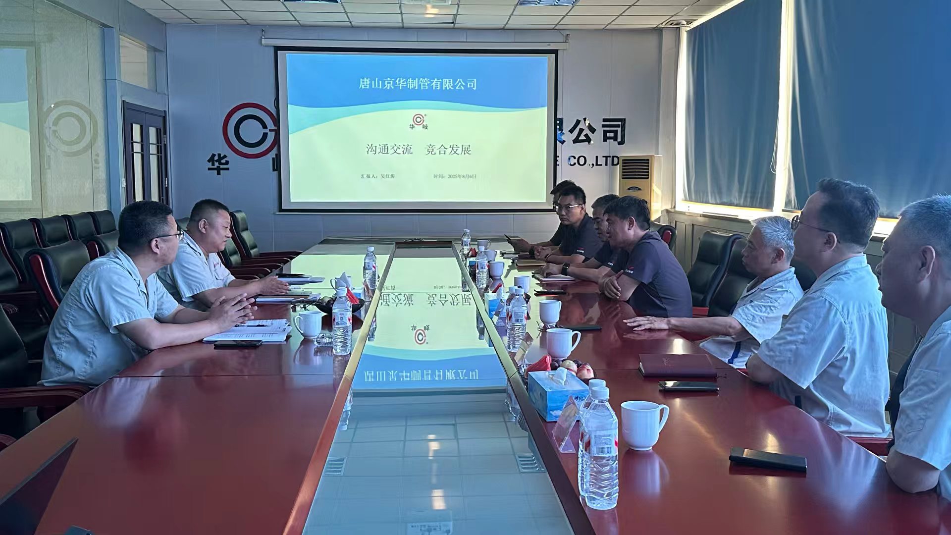 2025年8月6日,唐山正元管業有限公司總經理李茂華、遷安正大通用鋼管有限公司總經理文國強分別攜銷售主管人員應邀蒞臨唐山京華。公司總經理溫朝江、供銷副總胡武和銷售主管人員接待并陪同,三方就當前焊接鋼管行業面臨的市場態勢、客戶需求及發展困境展開深入探討,并達成共識。